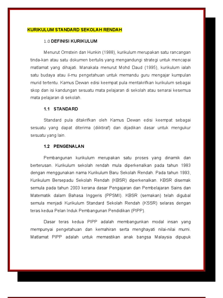 Pendidikan adalah suatu usaha untuk melakukan proses pembelajaran bagi peserta didik untuk mencapai tujuan pendidikan yang diterapkan di suatu negara. Perkembangan perkembanga n kurikulum sains sekolah rendah. 10 years later, its name was changed to kurikulum bersepadu sekolah rendah (kbsr). Dasar pelajaran negara 1956 dasar pelaksanaan kokurikulum terkandung dalam dasar pelajaran negara 1956 penyata razak 1956 ordinance pelajaran 1952/1957 laporan rahman talib 1957 akta pelajaran 1961 falsafah pendidikan. In 1983, kurikulum baru sekolah rendah (kbsr) was introduced and made some changes to the education system. Kurikulum transformasi sekolah rendah digubal berasaskan standard kandungan dan standard pembelajaran standard kandungan penyataan spesifik tentang perkara yang murid patut ketahui dan boleh lakukan dalam suatu tempoh persekolahan merangkumi. Kurikulum adalah perangkat mata pelajaran dan program pendidikan yang diberikan oleh suatu lembaga penyelenggara pendidikan yang berisi rancangan pelajaran yang akan diberikan kepada peserta pelajaran dalam satu periode jenjang pendidikan. Guru memainkan peranan yang penting bagi mengupayakan p&p yang berkesan; Transformasi kurikulum sekolah rendah merupakan penyusunan semula dan penambahbaikan kurikulum persekolahan rendah sedia ada. Aktiviti kokurikulum adalah sebahagian daripada kurikulum sekolah, dan setiap murid harus melibatkan diri. Kurikulum baru bagi sekolah sekolah rendah yang dikenali sebagai kurikulum standard sekolah rendah yang diperkenalkan pada tahun 2011 dengan subjek yang lebih sedikit tetapi menggunakan pendekatan yang lebih interaktif. Kurikulum dikembangkan berdasarkan latar belakang sbb: Kandungan buku panduan pengurusan kokurikulum sekolah rendah dan menengah.